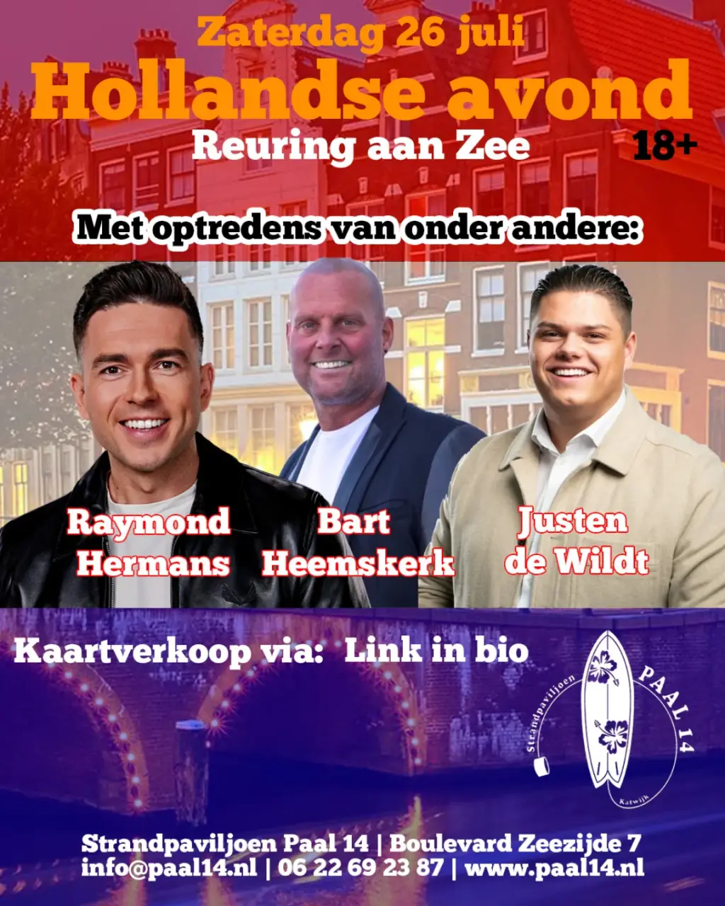 Tijdens Reuring aan Zee organiseren we weer een ouderwets gezellige Hollandse Avond bij Paal 14! Met optredens van Raymon Hermans, Justen de Wildt en Bart Heemskerk belooft het een avond vol feest, meezingers en strandgezelligheid te worden.